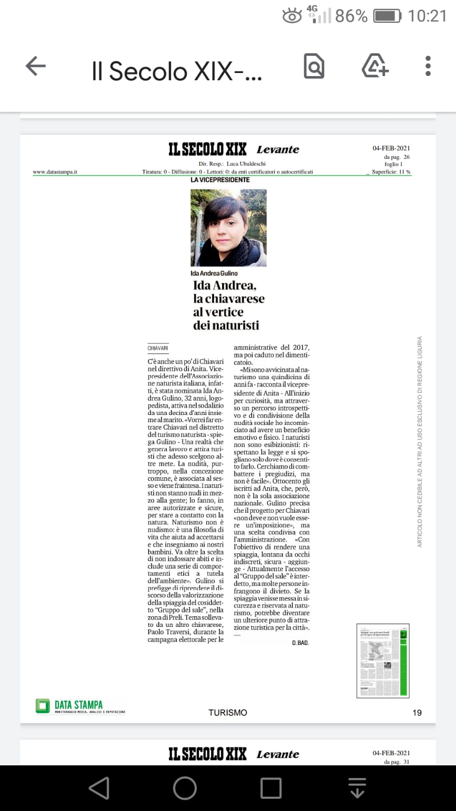 Inserito il - 04/02/2021 : 22:08:29 Leggo da altro Forum un interessante articolo dal titolo "Una Chiavarese al vertice dei naturisti". Di fatto una intervista alla vice-presidente di A.n.ita. (che tra tutte mi sembra la associazione più dinamica)in merito alla promozione del naturismo( e quindi anche nudismo)a Chiavari. Sarebbe un sogno se un giorno la spiaggia del"gruppo del sale" venisse messa in sicurezza,bonificata e autorizzata ufficialmente dal comune,in primis ne trarrebbe vantaggio Chiavari e tutto il Golfo del Tigullio che sono posti bellissimi e finalmente la Liguria potrebbe finalmente promuovere una sana e valida forma alternativa di turismo.