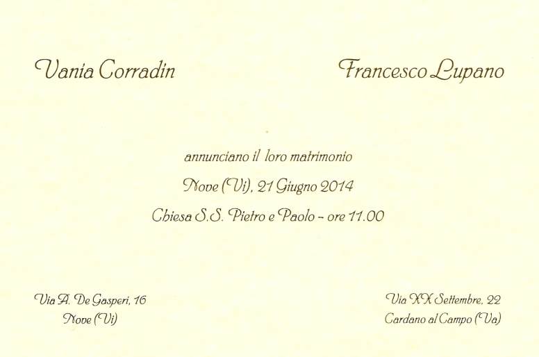 Carissimi Vania e Francesco, i miei più sentiti auguri di felicità e tutto il buono che posso. |