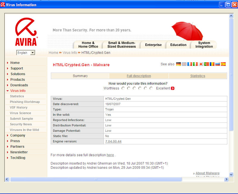 Visto questo, direi che coloro a cui la pagina di redirectory si è aperta regolarmente senza dare segnalazioni antivirali (ovviamnete a partire dall'altra sera dopo le 20 ad arrivare a stamattina prima delle 9) è bene facciano una scansione virale completa e si leggano la pagina che linko sotto relativa alla rimozione dell'eventuale virus http://www.symantec.com/security_response/writeup.jsp?docid=2008-110718-2219-99&tabid=3 |