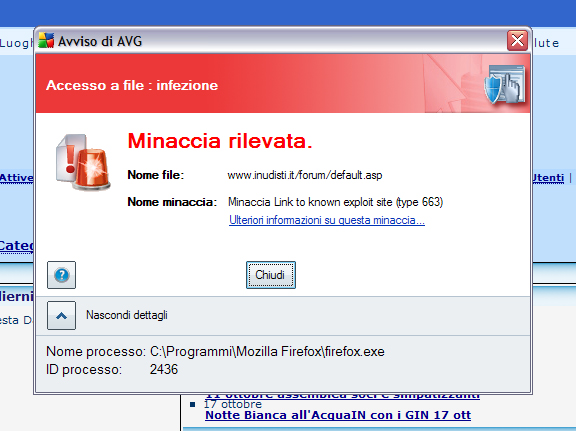 Non so se è un problema che ho solo io, ma da ieri, ogni volta che apro una pagina del forum (la home page del forum e la sezione "discussioni recenti"), AVIRA Antivirus, che è il software che ho installato nel mio PC portatile, mi segnala la presenza di un virus o comunque una qualche intrusione inopportuna..... è successo qualcosa di simile anche a qualcun'altro???? Non so se è un reale problema.... ma se qualcuno competente sa dirmi qualcosa