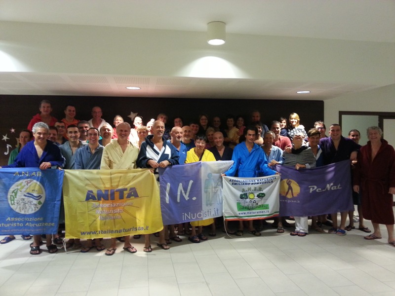 Mai fidarsi di istinti malevoli. Alle 15 la corsa alle sedie libere è stata ben grande. Quasi nessuno è rimasto alle saune, son scesi praticamente tutti. Una marea di gente era li pronta ad aspettare l'evento storico della presentazione della Prima Guida Naturista Nazionale. Dapprima si son sorteggiati i due massaggi gentilmente offerti da ANITA, che come ormai di consueto, segue con affetto i nostri raduni, e vi partecipa non solo attivamente, ma offre anche sempre un presente ai partecipanti. Uno stuolo di Bandiere ha tappezzato i muri della sala, e ha salutato l'arrivo di Carlo Alberto, a cui ha seguito la presentazione.  Parlano Marcolino, Ballardini, e ovviamente Castellani, che ricorda il lungo lavoro che ci è voluto per creare la guida, e sorpresa, ci rivela anche una montagna di strutture ai più sconosciute. Significato che quando si esce dagli schemi federali, si scoprono mille occasioni diverse su cui poter praticare nudonaturismo. Ed è stato reso pubblico anche il veto posto alla guida da parte del presidente Fenait, solo perchè erano elencate strutture non aderenti Fenait, tipo Zello, o associazioni tipo Assonatura, o siti come il nostro, che decisamente non piacciamo ne a lui ne al CD Fenait. Ma noi siamo cosi indipendenti e trasversali, che Carlo Alberto non ha ceduto ai ricatti, e è andato avanti lo stesso, anche senza il beneplacito di quel presidente, a cui tutti vorremmo voler bene, ma che coglie tutte le occasioni possibili per farsi odiare sempre di più da tuti. Un vero peccato essere snobbati da colui che dovrebbe rappresentarci a livello nazionale ed europeo. Peccato che non capisca che oltre il 50 % di noi è già tesserato, e che noi siamo i nudisti che lui dovrebbe amministrare e sostenere. (scusate la piccola nota polemica, ma era doveroso far sapere a tutti le cose come stanno). La promessa di Castellani di agiornare continuamente la guida chiude l'evento a cui segue il buffet offerto dallo stesso. Proseguono le saune fino alla cena, magistralmente messa in tavola dal sempre meraviglioso staff del Gardacqua. Circa 100 persone presenti. Alla fine della cena la sorpresa. I cari amici Napoletani, Igor (igomold presente), assieme a Matteone e Pieros, ci hanno inviato una montagna di roba: due pastiere napoletane, una torta di babà, e una bottiglia di limoncello produzione casalinga di Piero. Distribuiamo un pezzetto ciascuno di tutto per omaggiare i nostri amici lontani. Segue il discorso del sottoscritto, che oltre i dovuti ringraziamenti allo staff, ai presenti senza i quali la festa non esisterebbe, ricorda con affetto Serena che si è infortunata proprio il giorno prima di partire per Garda, e porta i saluti di Jambo che è ancora immobilizzato dopo l'incidente avuto appena dopo il raduno di Zello. Ma i migliori ringraziamenti vanno a colui che si è sorbettato tutto il lavoro di logistica del raduno, il grande, di nome e di fatto, Marcolino, a cui vanno tutti i nostri ringraziamenti più sinceri e sentiti. Segue il ringraziamento di Ramona che ricorda che è merito nostro e della nostra tigna (leggasi impuntarsi quando ci avevano negato l'accesso, imputarsi ad avere la lettera di scuse), se oggi a Garda si può stare senza costume, e hanno costruito l'ultima sauna da 100-120 gradi. Seguono ancora le foto di gruppo, che potete vedere in cima alla pagina. Bellissima la presenza delle bandiere che ogni volta aumentano, segno di una condivisione di intenti tra noi e le associazioni, sempre più ampia, voluta e desiderata. A ruota ci siamo tuffati in quelle calde acque fuori dal centro, sotto un freddo direi quasi polare.  Alla fine il carico dei doni ricevuti nel furgono di cordom, decine e decine di pacchi e cassette... non finivano mai. Ci abbiamo messo più di un'ora a caricare tutto. Alla faccia di chi parla male dei nudisti.